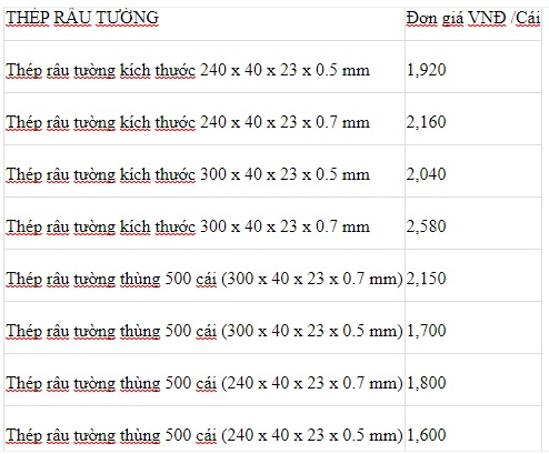 Có nhiều loại thép râu tường tùy theo độ dày và kích thước khác nhau. Thông thường, người ta phân loại theo độ dày: 0.3 mm, 0.5 mm và 0.7 mm. Chiều dài của thép râu tường cũng đa dạng, thường từ 240 mm đến 300 mm, với bề ngang chuẩn thường là 40 mm. Những kích thước này được thiết kế để phù hợp với nhiều loại công trình khác nhau.