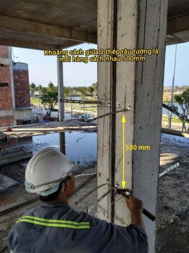 Quy định về thép râu trong xây tường là một yếu tố quan trọng giúp đảm bảo chất lượng và độ bền của công trình. Theo tiêu chuẩn, khoảng cách giữa hai thép râu được duy trì khoảng 50cm theo chiều dọc, nhằm tạo ra liên kết chắc chắn giữa cột bê tông và tường xây. Điều này giúp tường không bị lỏng lẻo, giữ cho toàn bộ cấu trúc vững vàng.