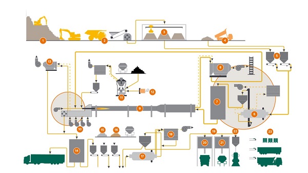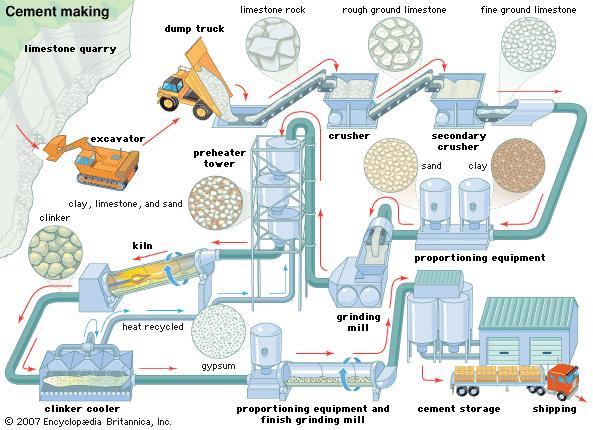 Quy trình sản xuất xi măng rất phức tạp, bắt đầu từ việc khai thác và tách chiết các nguyên liệu thô như đá vôi, đất sét và cát. Những nguyên liệu này được chế biến thành kích thước nhỏ hơn trước khi chuyển sang giai đoạn tiếp theo. Thông thường, tỷ lệ khai thác là 80% đá vôi và 20% đất sét.