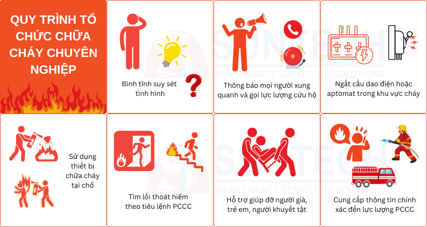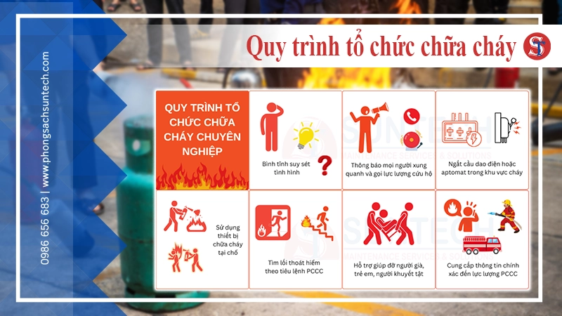 Quy trình tổ chức chữa cháy hiệu quả bao gồm 7 bước cơ bản, từ việc giữ bình tĩnh và xác định điểm cháy, đến việc báo động và ngắt nguồn điện. Trong từng bước, việc đánh giá tính nghiêm trọng của đám cháy là rất quan trọng, giúp xác định biện pháp ứng phó kịp thời.