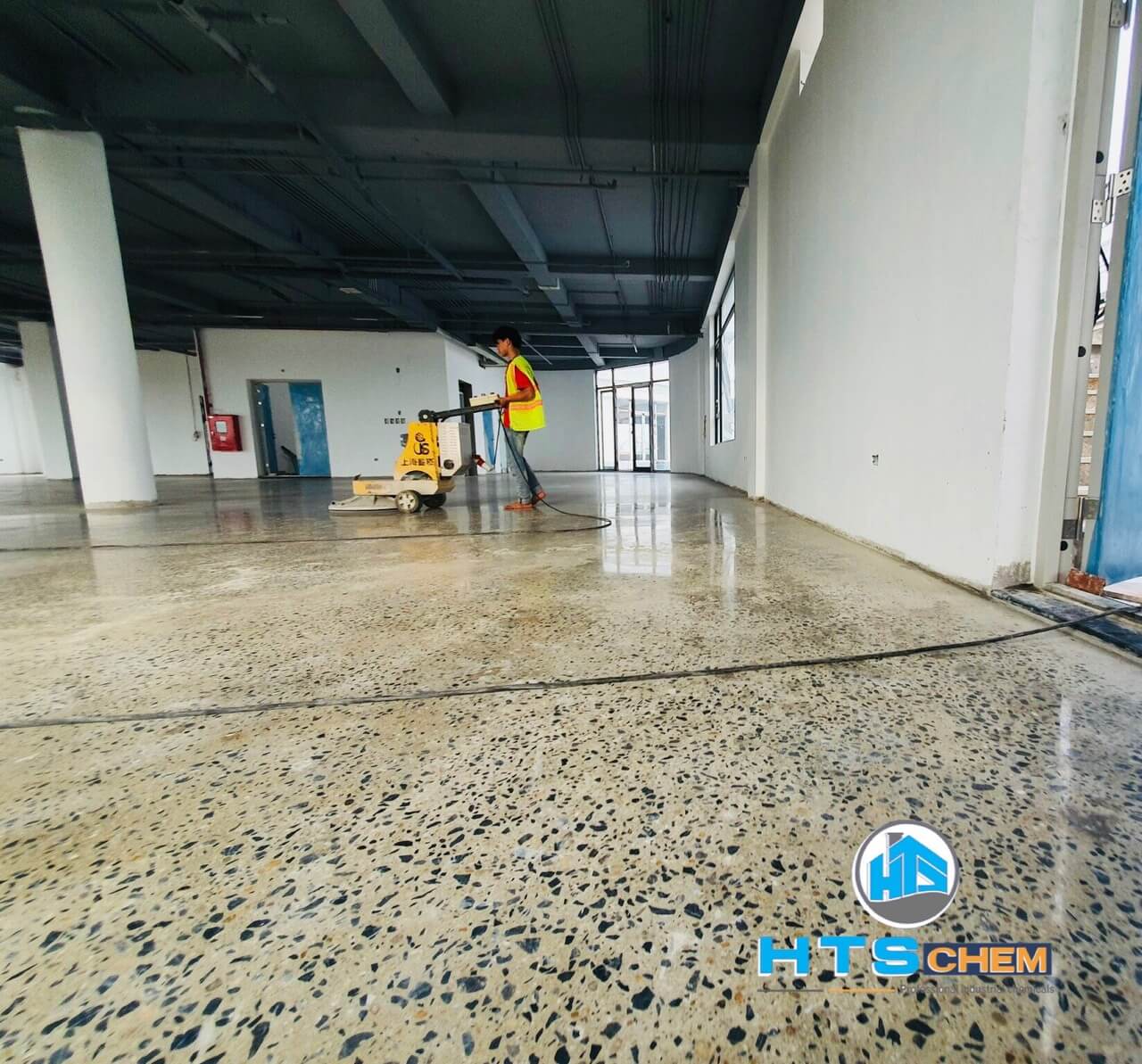 Tiếp theo, hóa chất tăng cứng sẽ được áp dụng để gia tăng độ chịu lực cho sàn. Bước này không chỉ giúp sàn bền hơn mà còn bảo vệ bề mặt khỏi những tác động ngoại vi. Sau khi hóa chất khô, tiến hành đánh bóng để tăng thêm tính thẩm mỹ.