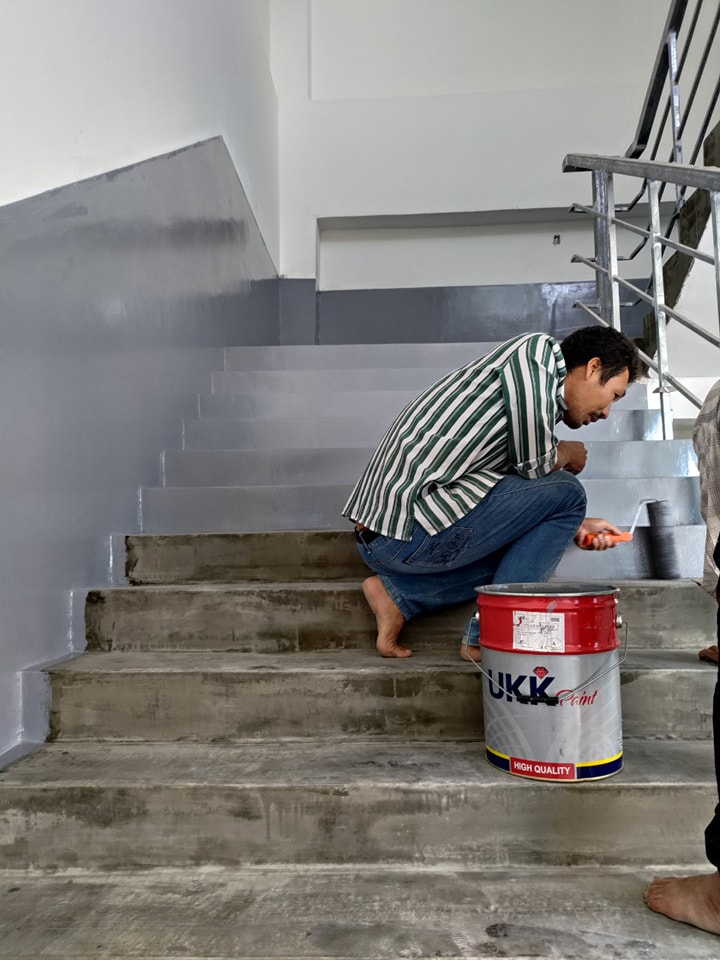 Sau khi bề mặt đã được chuẩn bị xong, bạn tiến hành thi công lớp sơn lót epoxy. Lớp sơn này không chỉ giúp tăng độ bám dính mà còn tạo nền tảng cho lớp sơn phủ phía sau. Khi lớp sơn lót đã khô, chúng ta sẽ tiến hành độ che phủ bằng lớp sơn epoxy đầu tiên. Sử dụng con lăn, bạn nhẹ nhàng phủ sơn lên bề mặt cầu thang, đảm bảo không để lại vết rỗ hay nhăn.