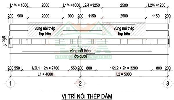 Cụ thể, ở lớp thép trên, không được nối tại khu vực từ tim cột đến 1/4 nhịp dầm. Ngược lại, ở lớp thép dưới, việc nối cần tránh khu vực bụng dầm trong khoảng ¾ nhịp. Đặc biệt, chiều dài nối thép tối thiểu phải bằng 30 lần đường kính của thanh thép, tức là nếu thanh thép có đường kính D16, chiều dài nối phải ít nhất 480mm.
