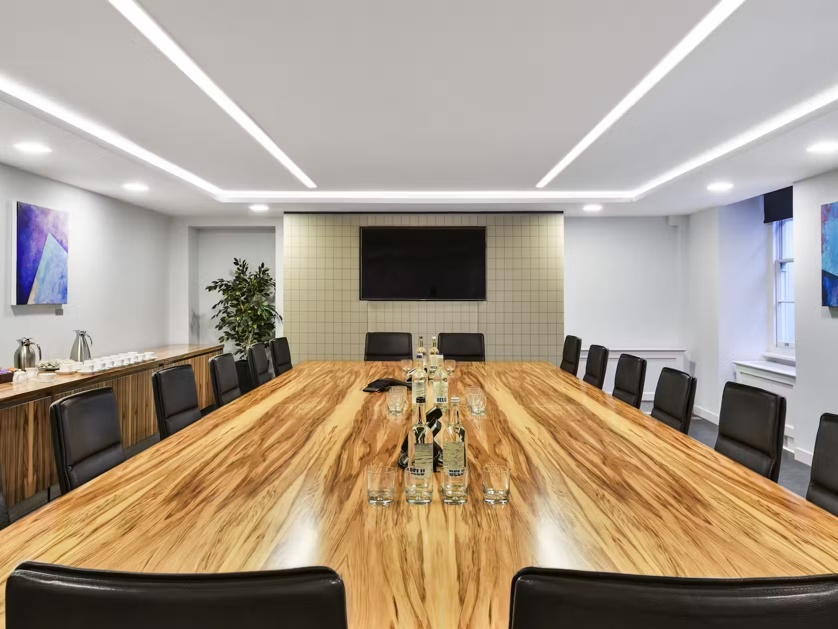 Với những phòng họp rộng, trần thạch cao tiêu âm dạng lỗ vuông lớn rất phù hợp vì giúp giảm độ dội âm, cải thiện tập trung cho người tham dự. Kết hợp cách âm tốt và không gian mở, màu sắc tươi sáng sẽ làm cho cuộc họp bớt căng thẳng và hiệu quả hơn.