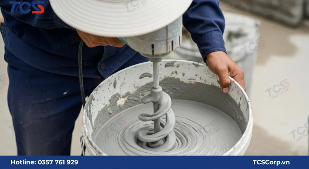 Cách pha rất đơn giản: Đầu tiên, đổ 2/3 lượng nước vào thùng, sau đó từ từ cho xi măng vào. Hãy khuấy đều bằng tay hoặc máy để hỗn hợp trở nên đồng nhất. Tỷ lệ xi măng và nước có thể điều chỉnh tùy thuộc vào nhu cầu sử dụng, nhưng hãy nhớ rằng nếu bạn muốn chống thấm hiệu quả, tỷ lệ pha là 1 phần nước với 1,5 phần xi măng cũng rất hợp lý.
