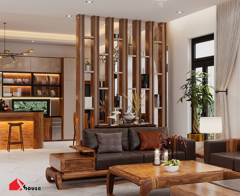 Vách ngăn gỗ công nghiệp tạo không gian sang trọng cho phòng khách bếp